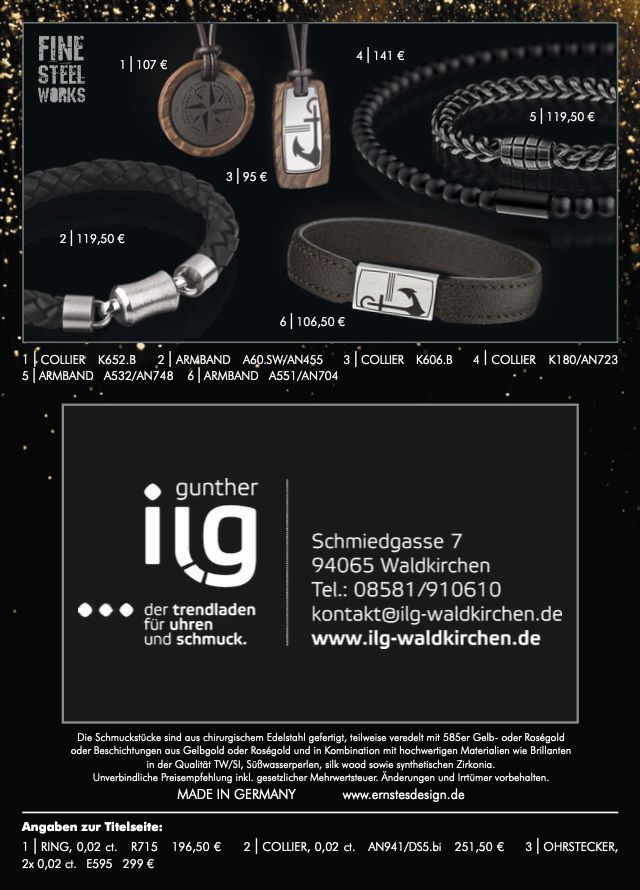 ERNSTES DESIGN- Kreationen kleiden so unaufdringlich, dass ihnen nicht nur die Frauen verfallen, sondern selbst „Mann“ sich traut. Apropos trauen. Natürlich gibt es auch eine große Auswahl stählerner Partnerschaftsringe.